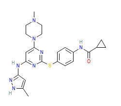 | ABL1 | Abl | TK | 2f4j | A | | cyclopropanecarboxylic acid {4-[4-(4-methyl-piperazin-1-yl)-6-(5-methyl-2h-pyrazol-3-ylamino)-pyrimidin-2-ylsulfanyl]-phenyl}-amide | Human | 1090 | 0.80 | |